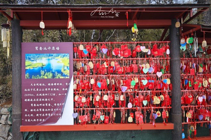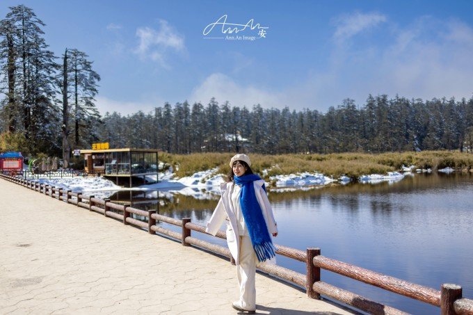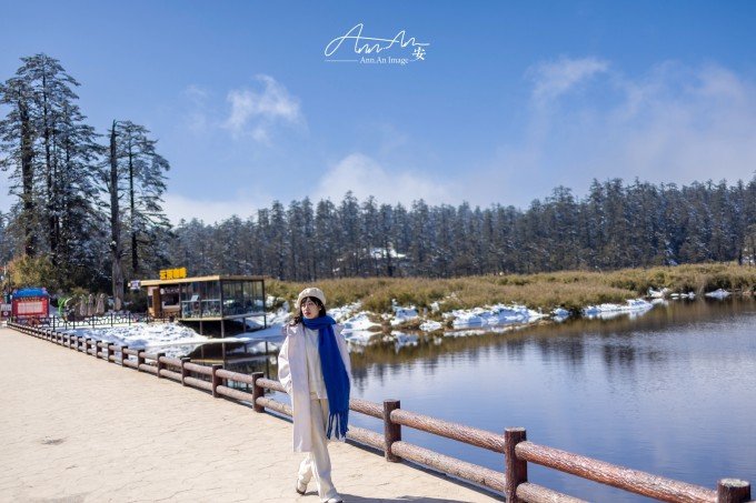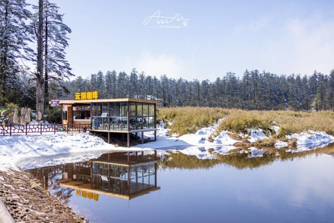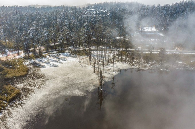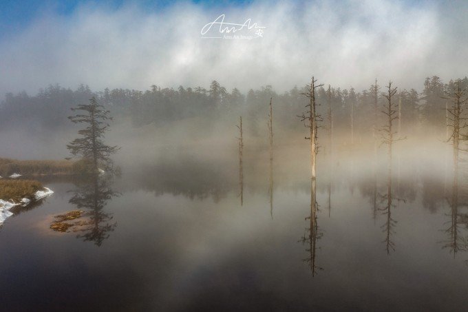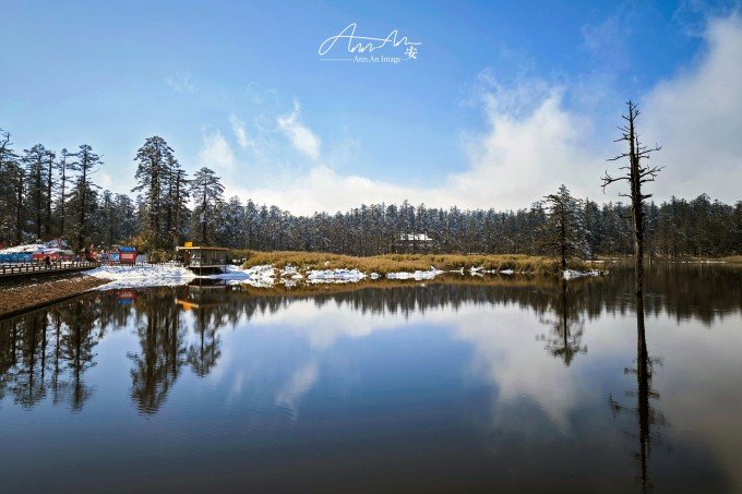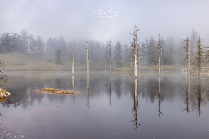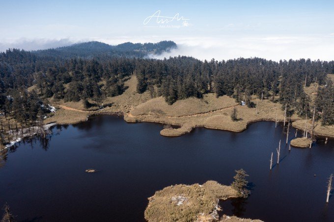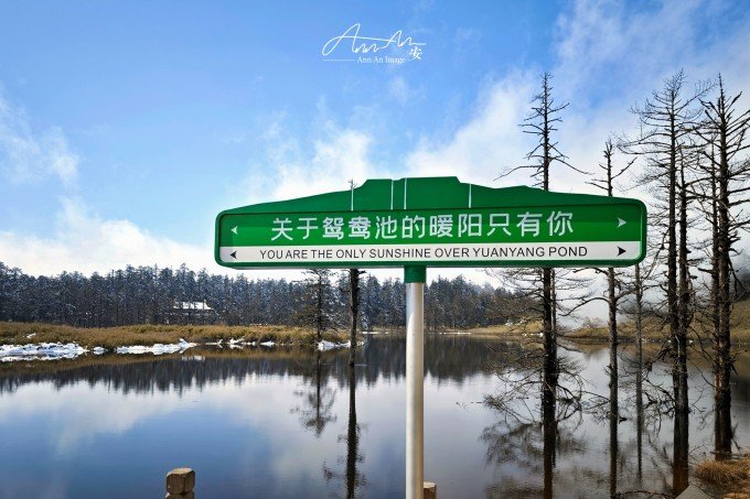 等走到鸳鸯池的时候,太阳出来了,气温升高,云雾在湖面疾驰飘向远方成为温柔云絮一抹,湖水明净透亮,水中树木充满垂直优雅的线条感,坐在湖边晒太阳,幸福感满溢。听说在寒冬这里会出现冰封现象。