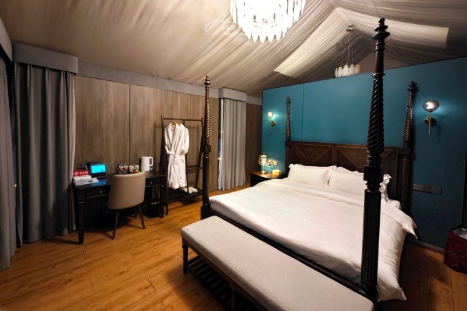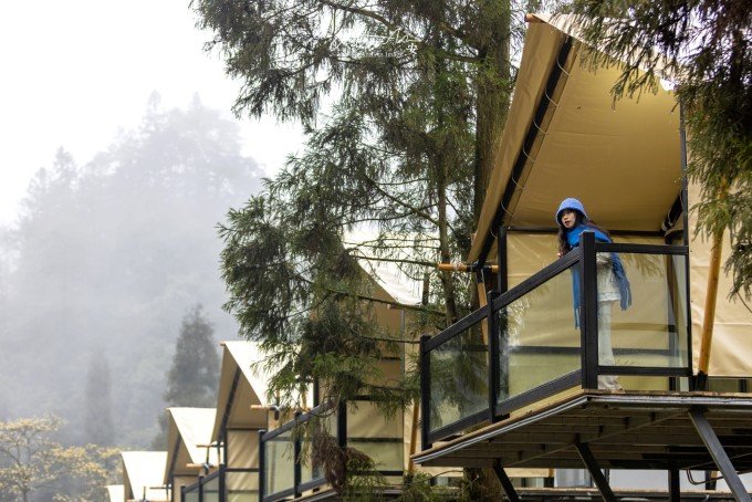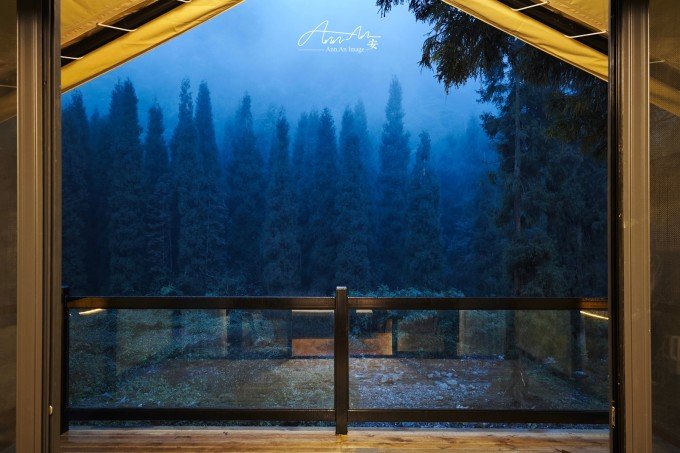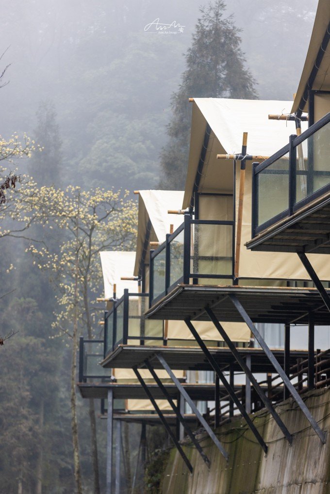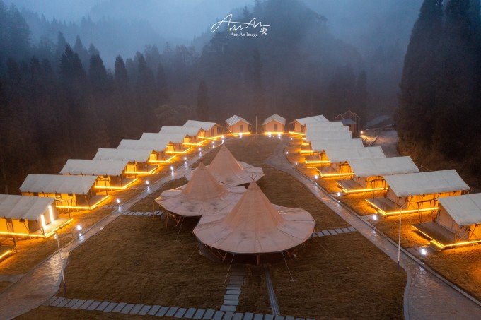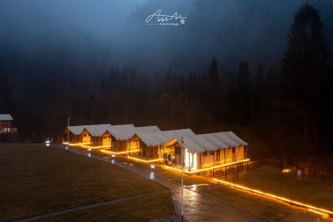 大山脚下的一片营地,夜幕降临,灯光亮起,暖黄色的光在雨夜中影影绰绰。沸腾的羊肉汤锅驱走夜晚的寒气。营地的房间看似简易,走进去房间设施完善,配备了电热毯、地暖,早晨喝一杯咖啡,在阳台上呼吸山中雨后的空气,溪流潺潺,身心得到放松。