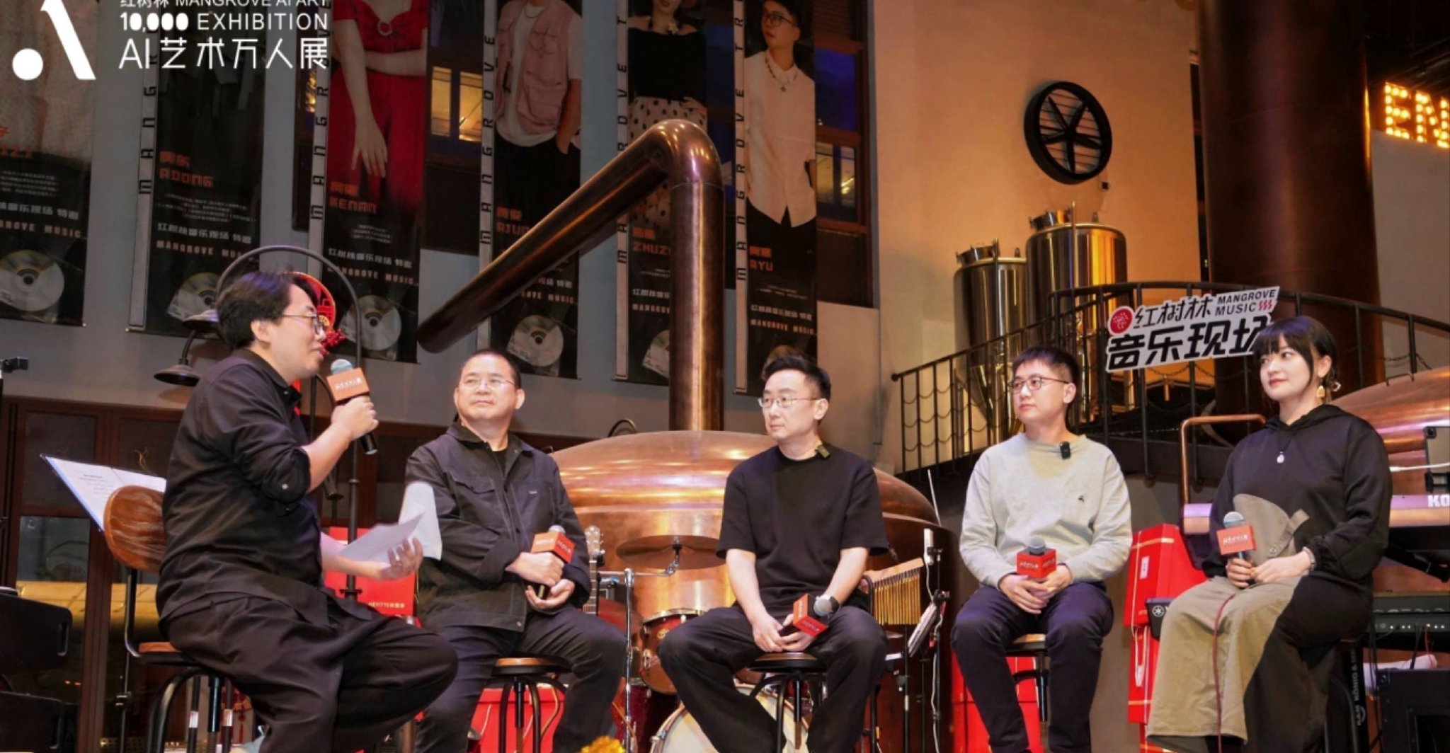 (左起)红树林AI电影周单元策展人宋东桓先生;红树林品牌创始人、今日美术馆理事长张宝全先生;中国著名电影导演、红树林AI电影周主席陆川先生;生数科技联合创始人兼CEO 唐家渝先生;AI艺术家海辛女士