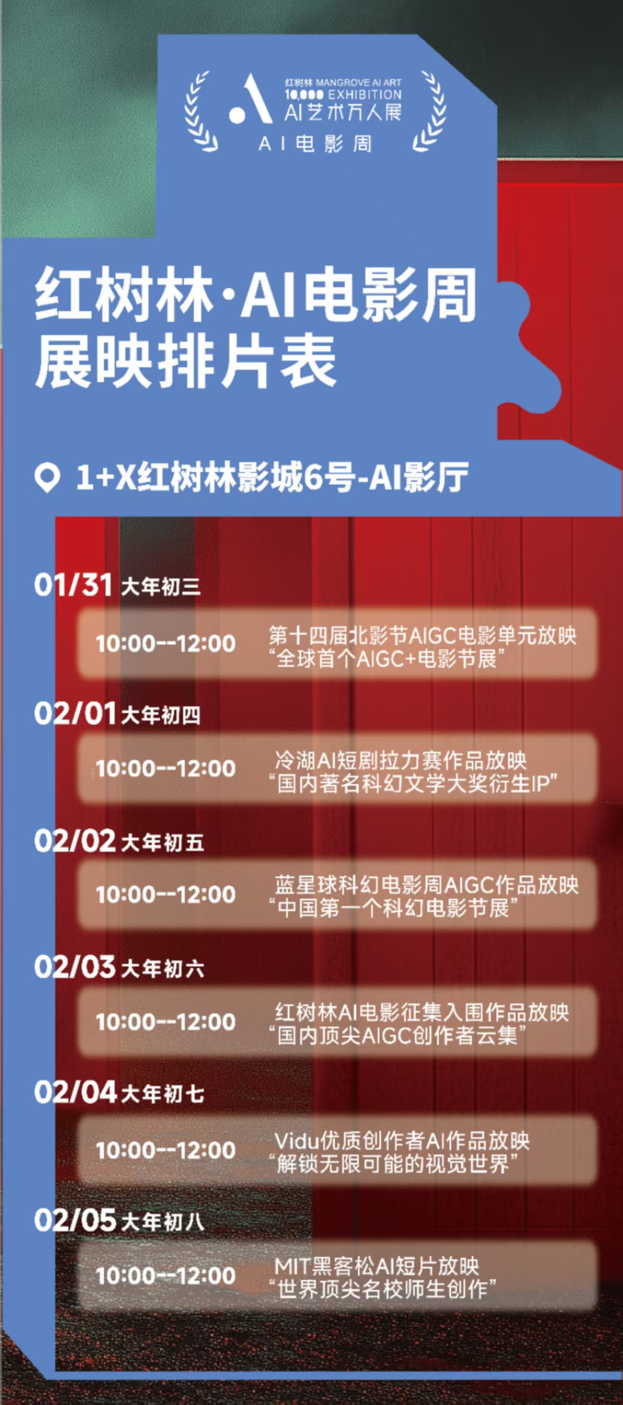 红树林· AI 电影周将从大年初二一直持续到大年初八,整个电影周期间,将展映来自北京国际电影节AIGC电影单元、冷湖AI短剧拉力赛、蓝星球科幻电影周、MIT黑客松、Vidu视频大模型及红树林AI艺术万人展AI电影版块的 80部全球顶尖创作水准的AI电影短片。这些作品涵盖科学、艺术、哲学等多个维度,不仅代表了2024年全球AI影像创作的最高水准,同时也展现了AI在影像创作领域的多样性与想象力。感兴趣的观众可在1+X红树林影城AI电影专属影厅免费预约,根据自己的度假行程来刷片。