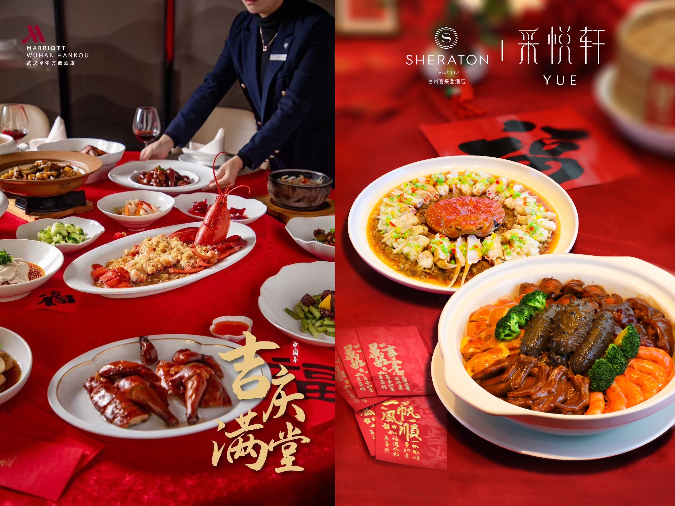 由左至右:武汉卓尔万豪酒店万悦中餐厅  “万豪鸿运宴”团年盛宴、台州喜来登酒店采悦轩中餐厅  “主厨定制”年夜菜肴