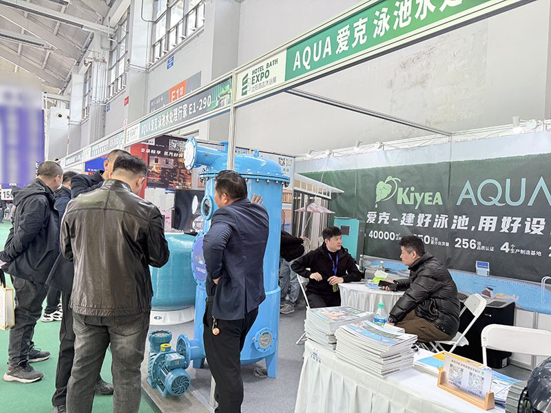 其中,AQUA爱克中压紫外线杀菌器凭借其无化学残留的杀菌特性,吸引了众多采购商的关注。该设备利用紫外线的杀菌特性,无化学残留地杀灭水中有害微生物,守护泳池用水安全。展位工作人员忙碌地为参观者进行产品演示和技术讲解,现场互动频繁,气氛活跃。