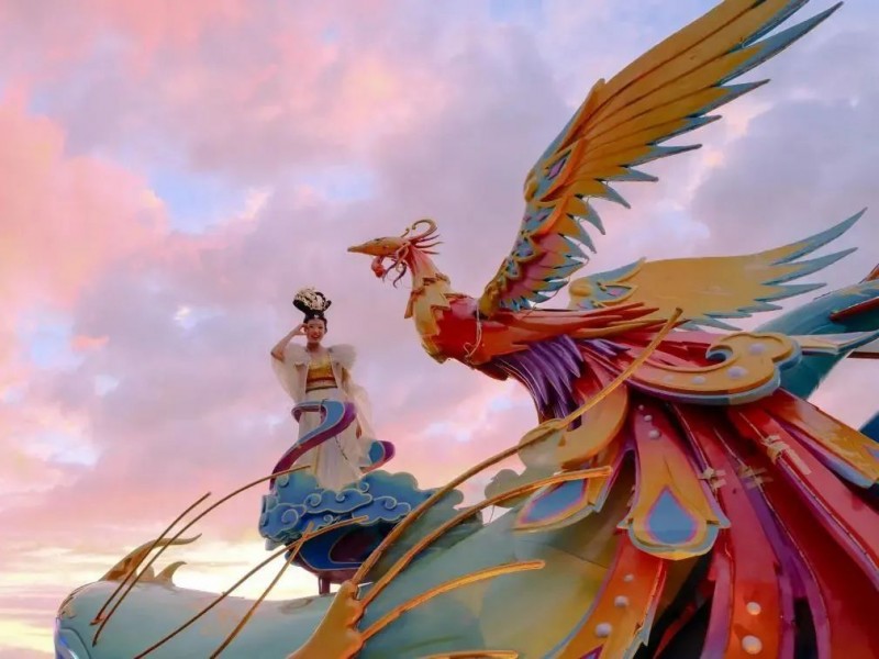 彩卵的弧度复刻了红山文化玉璧的曲线,云纹的流动暗合《山海经》中“凤凰翔于东,鲲鹏击于南”的宇宙观。当机械装置带动简狄的衣袖缓缓舒展,五色彩卵在灯光下依次亮起——赤象征火焰,黄代表土地,青呼应草木,白对应云朵,黑隐喻深渊,恰是华夏先民对“天地五行”的最初认知。而花车后半部分神兽凤凰展翅翱翔九天,整个花车高低错落生动形象,具有强烈的故事感,各个形象造型对比强烈增加整个花车的视觉冲击。展示出花车不止是“展示神话”,更是让神话“活”在当下。