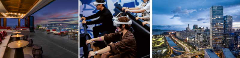 由左到右:深圳前海华侨城瑞吉酒店顶楼瑞吉阿斯特露台酒吧将前海湾一览无余、入住深圳湾万丽酒店沉浸于“全感VR”联名客房套餐、深圳湾福朋喜来登酒店繁华夜景